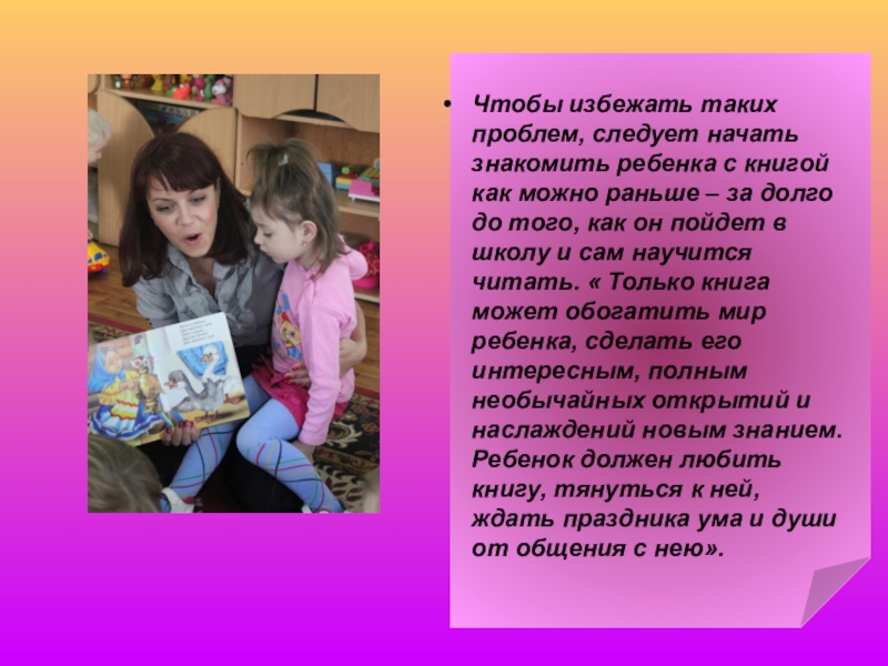 можно раньше – за долго до того, как он пойдет в школу и сам научится читать. « Только книга может обогатить мир ребенка, сделать его интересным, полным необычайных открытий и наслаждений новым знанием. Ребенок должен любить книгу, тянуться к ней, ждать праздника ума и души от общения с нею».