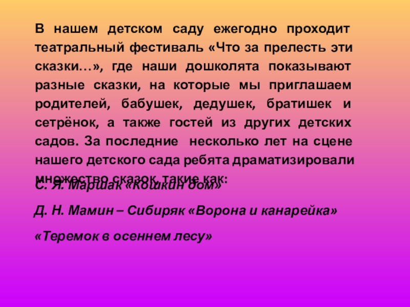 Слайд 23В нашем детском саду ежегодно проходит театральный фестиваль «Что за прелесть