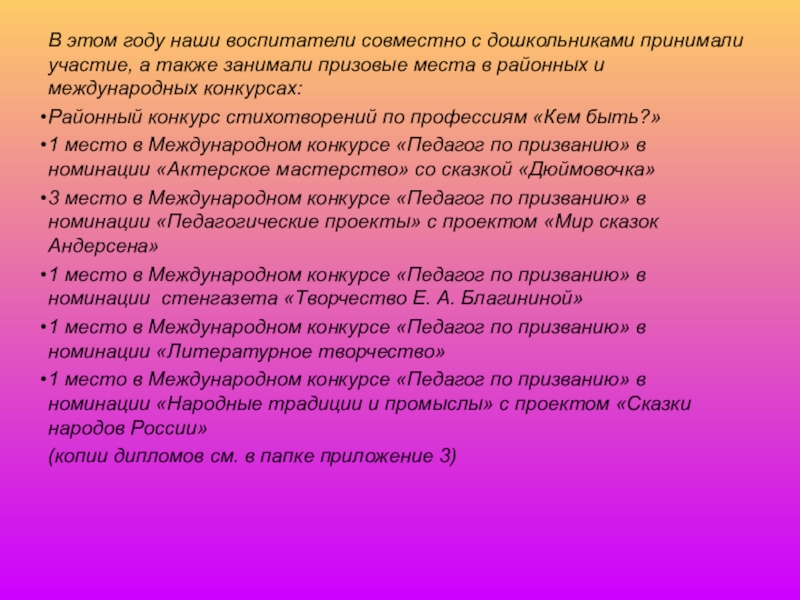 3 место в Международном конкурсе «Педагог по призванию» в номинации «Педагогические проекты» с проектом «Мир сказок Андерсена»