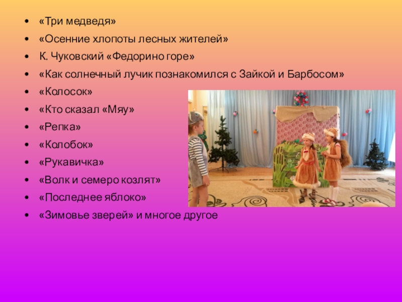 эти сказки…», где наши дошколята показывают разные сказки, на которые мы приглашаем родителей, бабушек, дедушек, братишек и сетрёнок, а также гостей из других детских садов. За последние несколько лет на сцене нашего детского сада ребята драматизировали множество сказок, такие как: