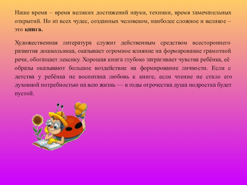 Художественная литература служит действенным средством всестороннего развития дошкольника, оказывает огромное влияние на формирование грамотной речи, обогащает лексику. Хорошая книга глубоко затрагивает чувства ребёнка, её образы оказывают большое воздействие на формирование личности. Если с детства у ребёнка не воспитана любовь к книге, если чтение не стало его духовной потребностью на всю жизнь — в годы отрочества душа подростка будет пустой.