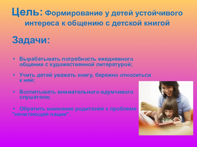 Слайд 6Цель: Формирование у детей устойчивого интереса к общению с детской книгой