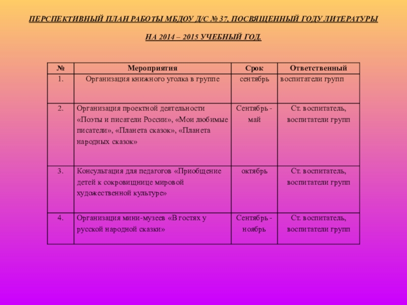 Слайд 12ПЕРСПЕКТИВНЫЙ ПЛАН РАБОТЫ МБДОУ Д/С № 37, ПОСВЯЩЕННЫЙ ГОДУ ЛИТЕРАТУРЫ