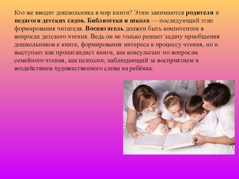 Слайд 49Кто же вводит дошкольника в мир книги? Этим занимаются родители и