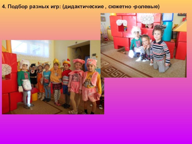 Слайд 254. Подбор разных игр: (дидактические , сюжетно -ролевые)
