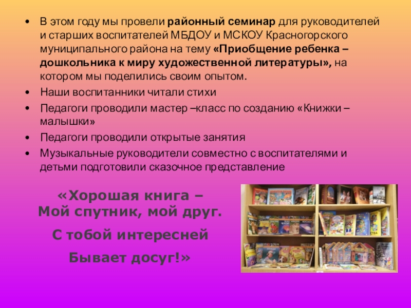 воспитателей МБДОУ и МСКОУ Красногорского муниципального района на тему «Приобщение ребенка – дошкольника к миру художественной литературы», на котором мы поделились своим опытом.