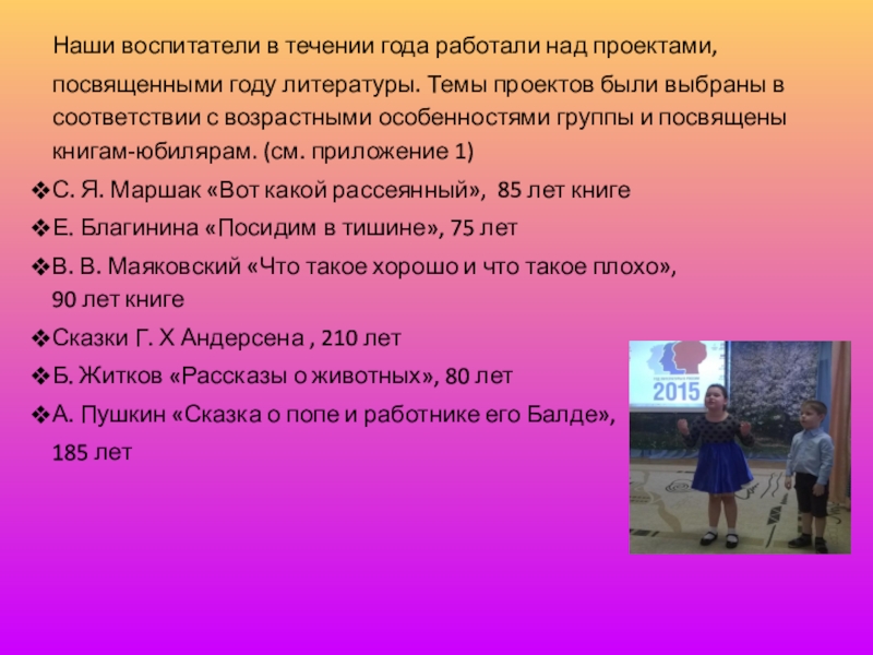 проектов были выбраны в соответствии с возрастными особенностями группы и посвящены книгам-юбилярам. (см. приложение 1)