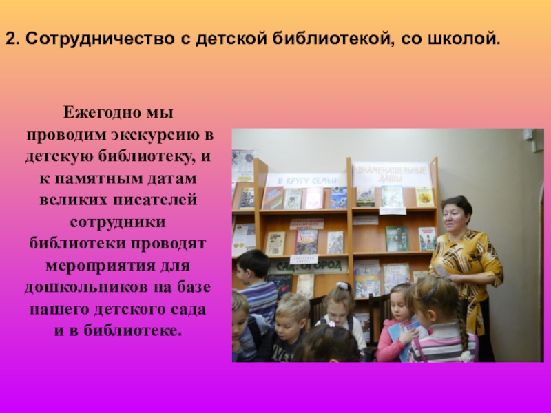 Слайд 182. Сотрудничество с детской библиотекой, со школой.