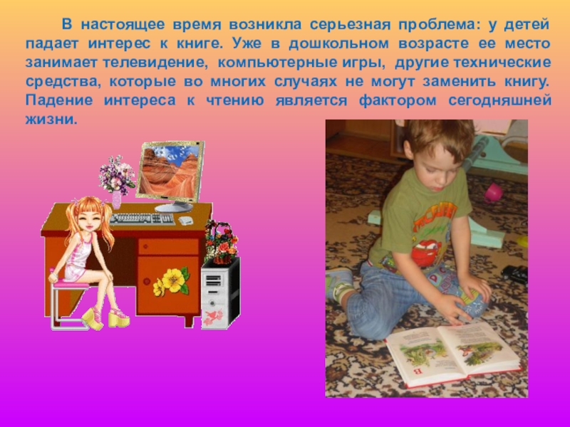 падает интерес к книге. Уже в дошкольном возрасте ее место занимает телевидение, компьютерные игры, другие технические средства, которые во многих случаях не могут заменить книгу. Падение интереса к чтению является фактором сегодняшней жизни.