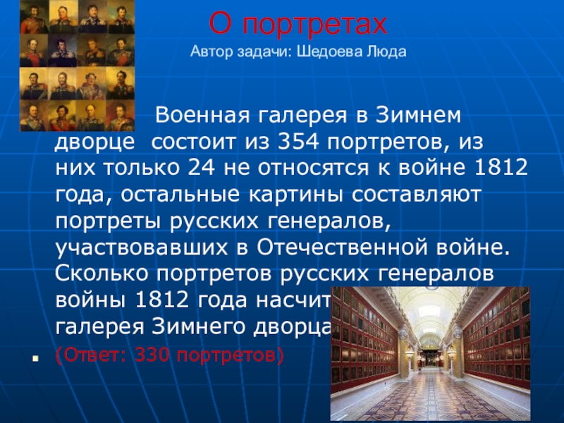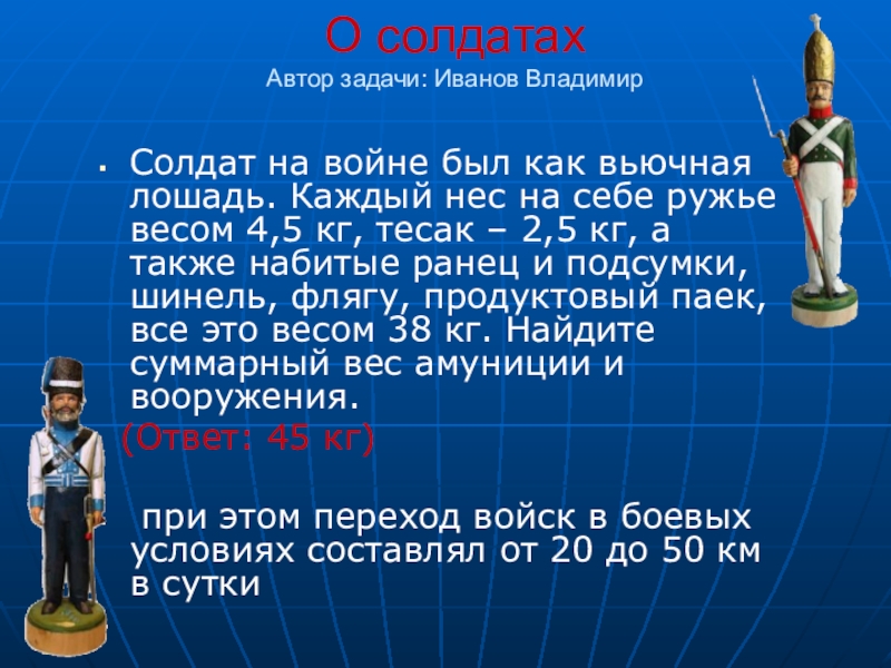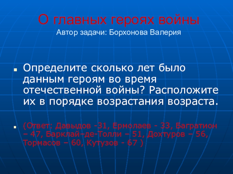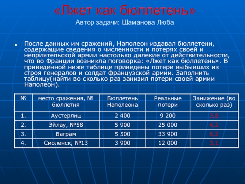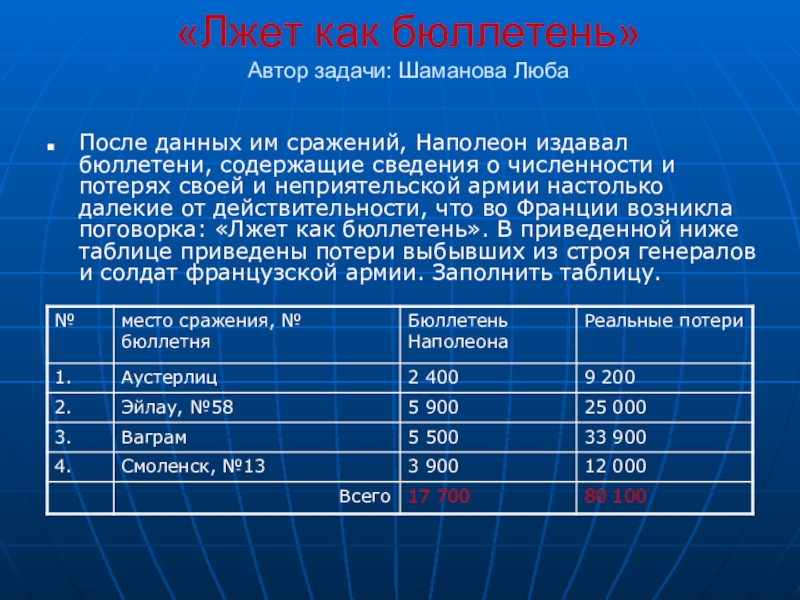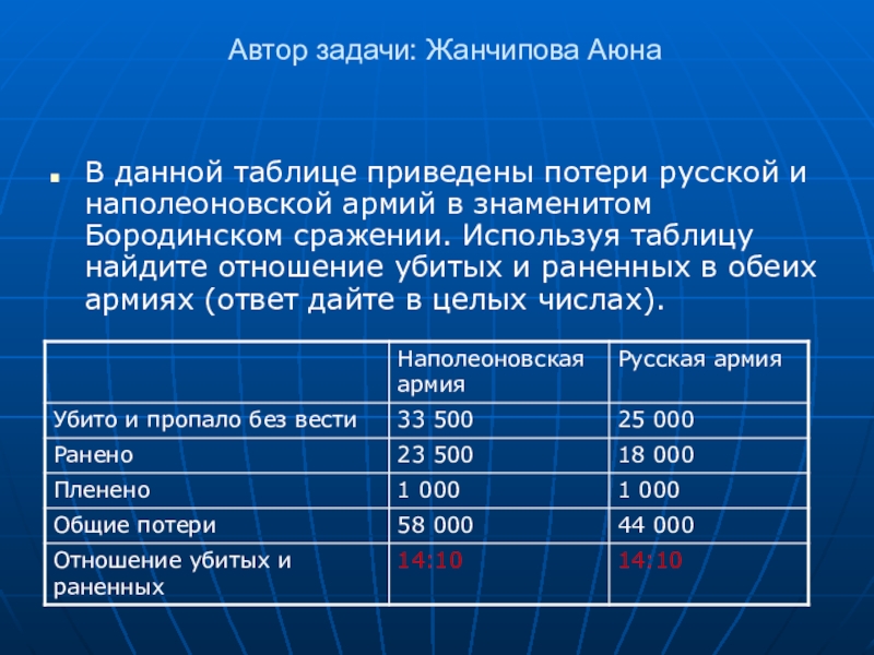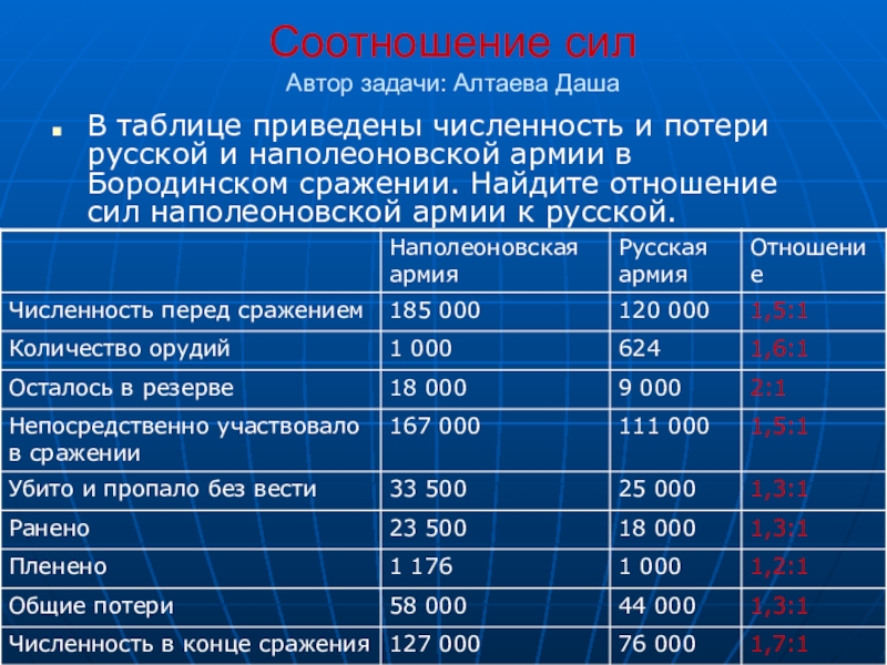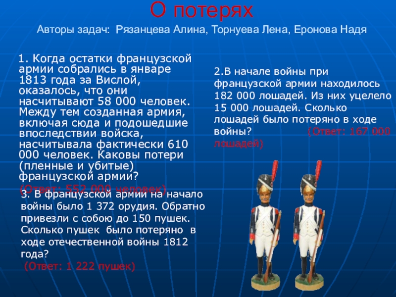 2.В начале войны при французской армии находилось 182 000 лошадей. Из них уцелело 15 000 лошадей. Сколько лошадей было потеряно в ходе войны? (Ответ: 167 000 лошадей)