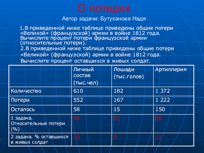 2.В приведенной ниже таблице приведены общие потери «Великой» (французской) армии в войне 1812 года. Вычислите процент оставшихся в живых солдат.