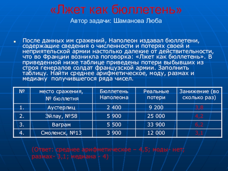 (Ответ: среднее арифметическое – 4,5; моды- нет; размах- 3,1; медиана - 4)