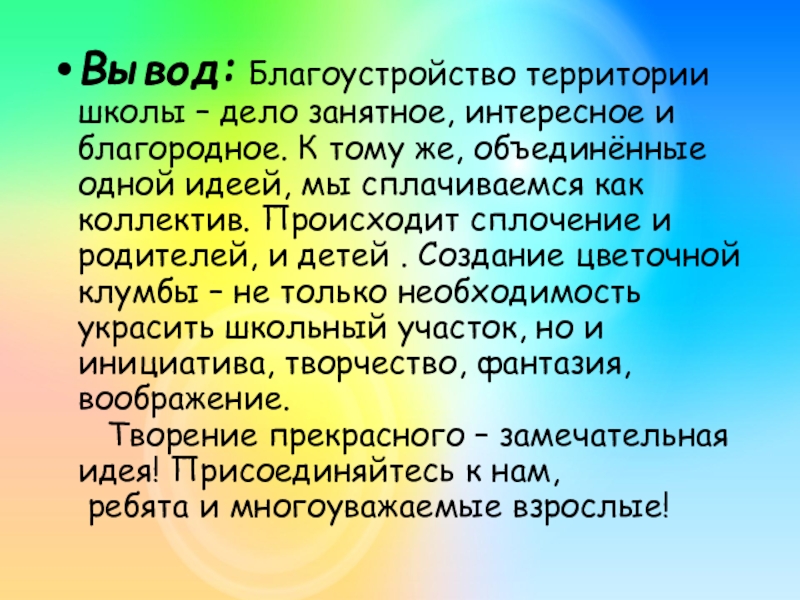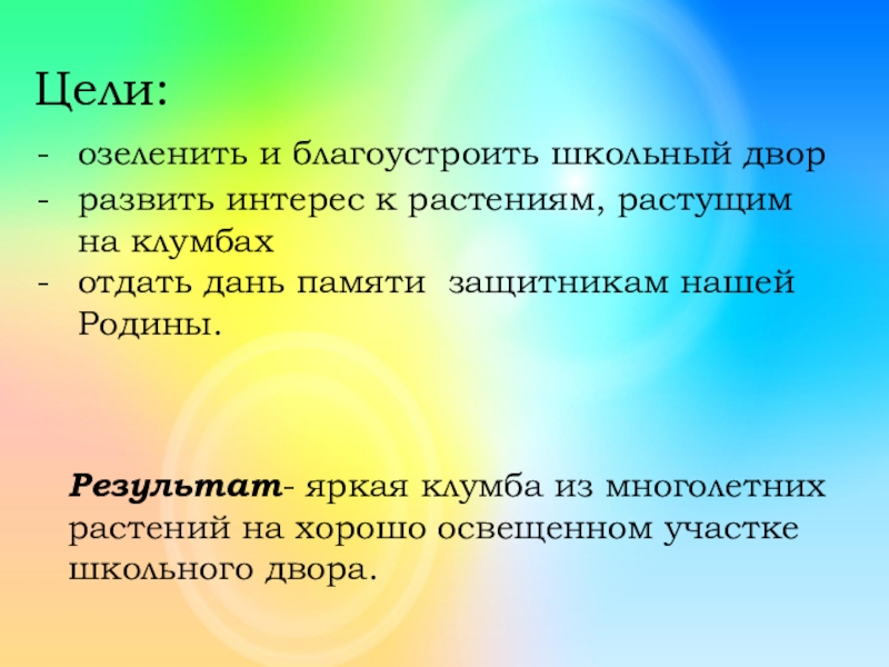 Результат- яркая клумба из многолетних растений на хорошо освещенном участке школьного двора.