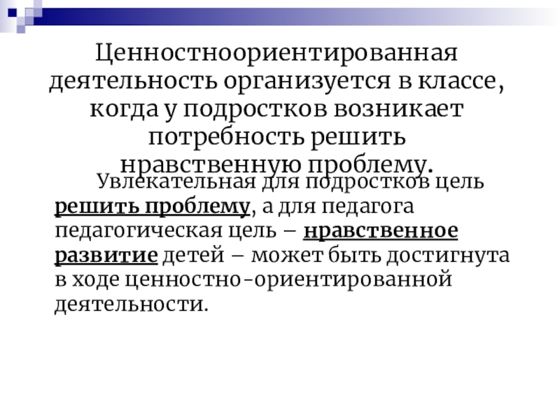 Увлекательная для подростков цель решить проблему, а для педагога педагогическая цель – нравственное развитие детей – может быть достигнута в ходе ценностно-ориентированной деятельности.