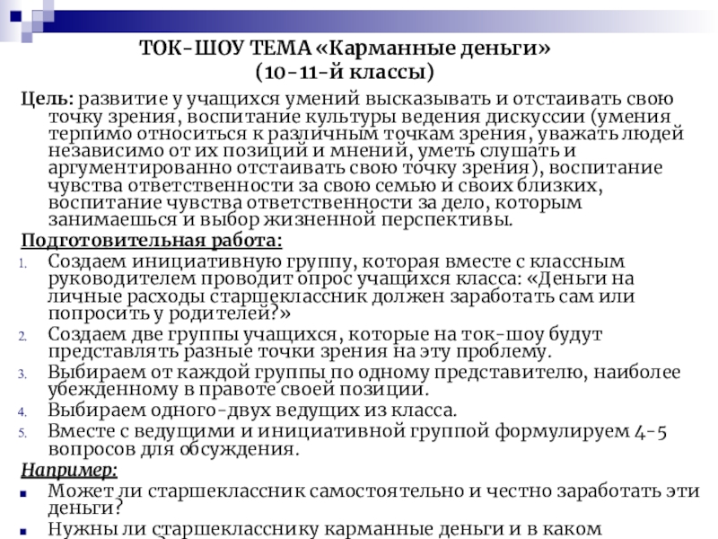 ТОК-ШОУ ТЕМА «Карманные деньги»