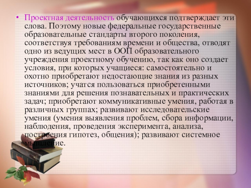 стандарты второго поколения, соответствуя требованиям времени и общества, отводят одно из ведущих мест в ООП образовательного учреждения проектному обучению, так как оно создает условия, при которых учащиеся: самостоятельно и охотно приобретают недостающие знания из разных источников; учатся пользоваться приобретенными знаниями для решения познавательных и практических задач; приобретают коммуникативные умения, работая в различных группах; развивают исследовательские умения (умения выявления проблем, сбора информации, наблюдения, проведения эксперимента, анализа, построения гипотез, общения); развивают системное мышление.