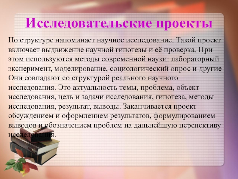 По структуре напоминает научное исследование. Такой проект включает выдвижение научной