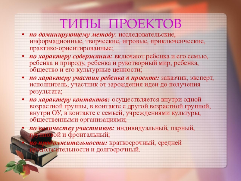 по доминирующему методу: исследовательские, информационные, творческие, игровые, приключенческие, практико-ориентированные;
