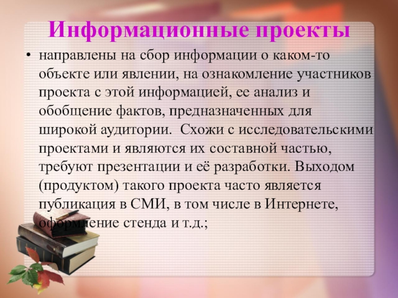 ознакомление участников проекта с этой информацией, ее анализ и обобщение фактов, предназначенных для широкой аудитории. Схожи с исследовательскими проектами и являются их составной частью, требуют презентации и её разработки. Выходом (продуктом) такого проекта часто является публикация в СМИ, в том числе в Интернете, оформление стенда и т.д.;