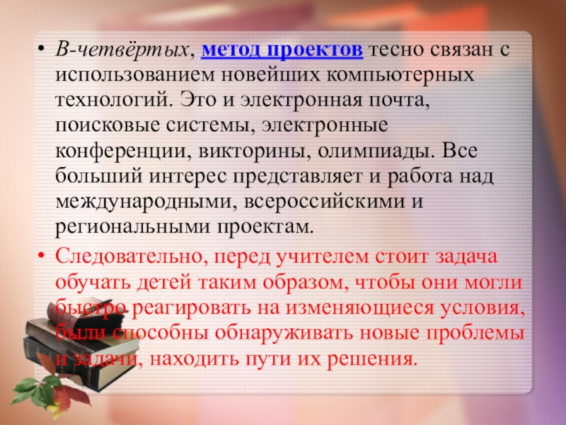 Слайд 6В-четвёртых, метод проектов тесно связан с использованием новейших компьютерных технологий. Это и электронная