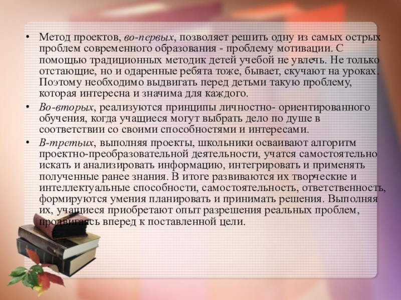 Метод проектов, во-первых, позволяет решить одну из самых острых проблем современного образования