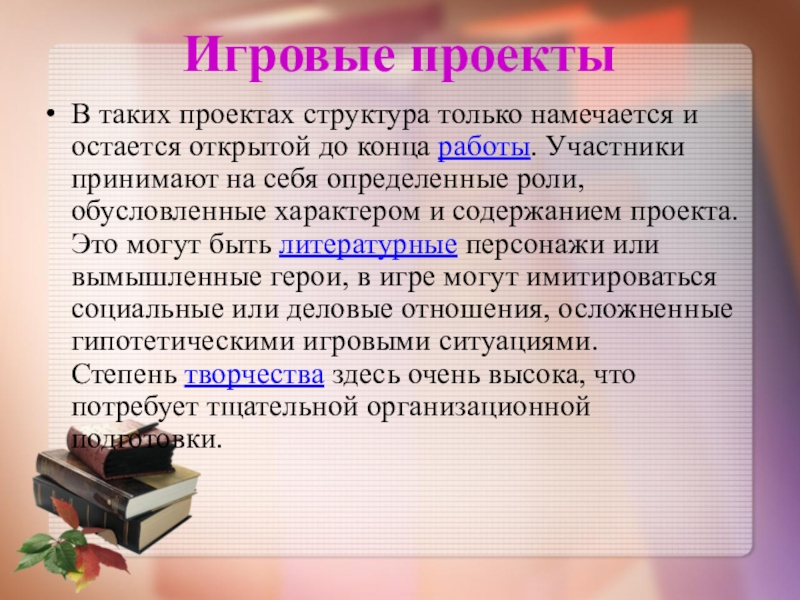 конца работы. Участники принимают на себя определенные роли, обусловленные характером и содержанием проекта. Это могут быть литературные персонажи или вымышленные герои, в игре могут имитироваться социальные или деловые отношения, осложненные гипотетическими игровыми ситуациями. Степень творчества здесь очень высока, что потребует тщательной организационной подготовки.