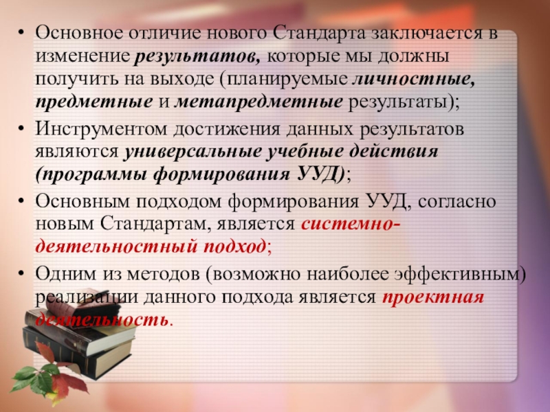 Слайд 2Основное отличие нового Стандарта заключается в изменение результатов, которые мы должны получить на