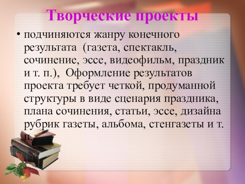 подчиняются жанру конечного результата (газета, спектакль, сочинение, эссе, видеофильм, праздник