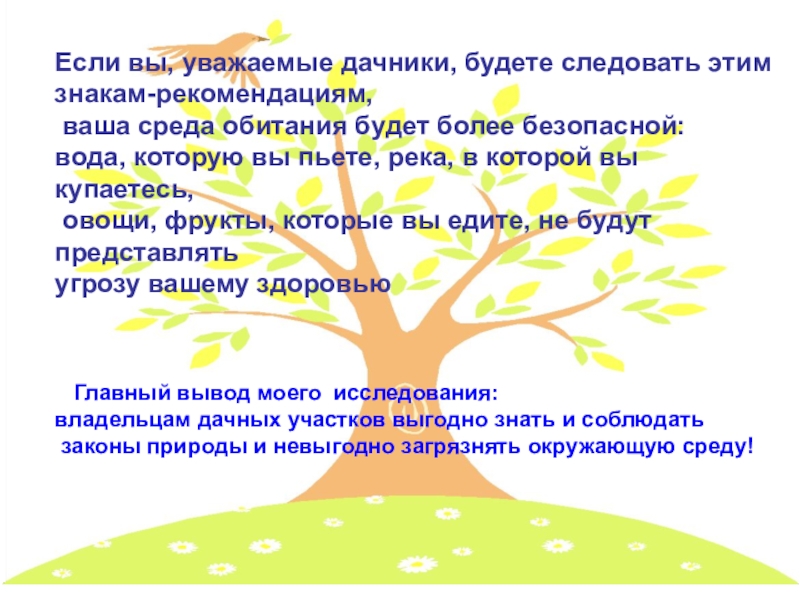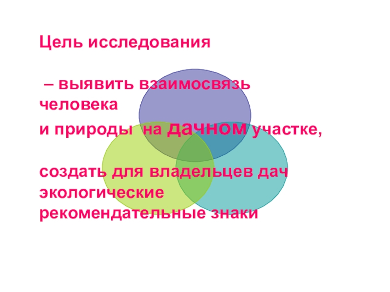 Цель исследования – выявить взаимосвязь человекаи природы на дачном участке, создать для владельцев дач экологические рекомендательные знаки