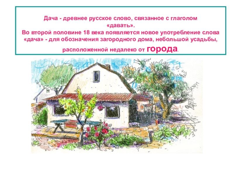 Слайд 3 Дача - древнее русское слово, связанное с глаголом «давать». Во второй половине