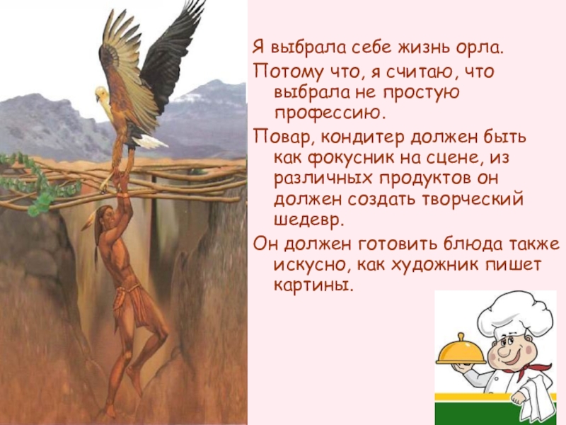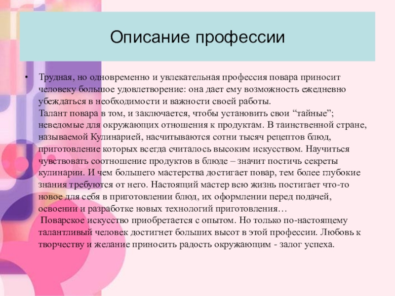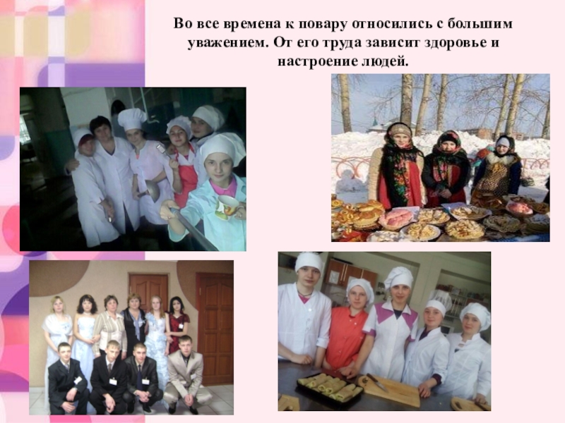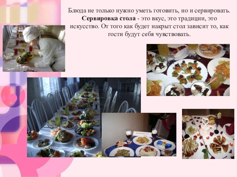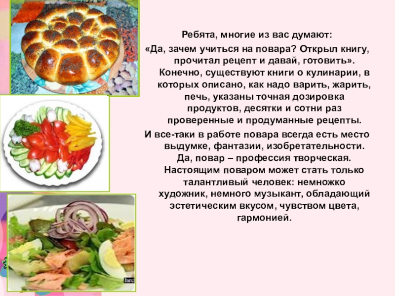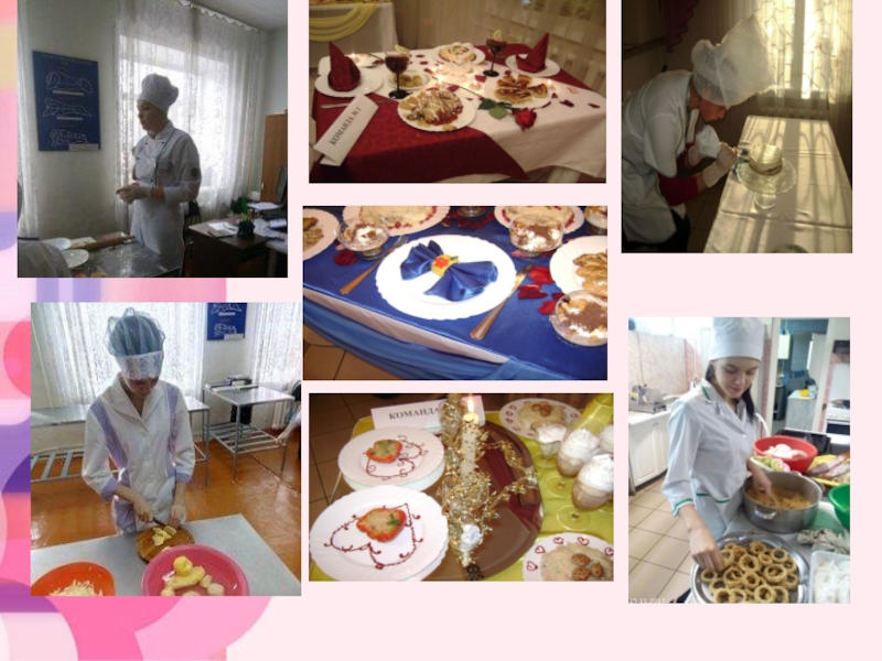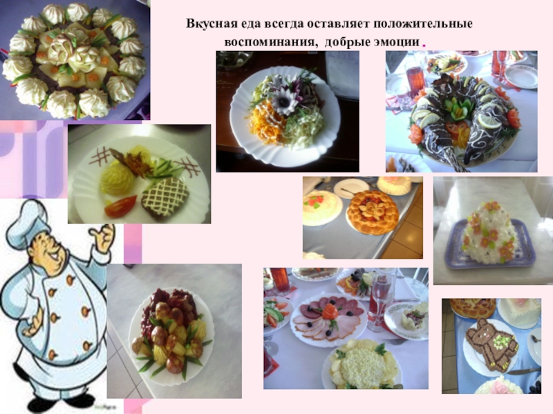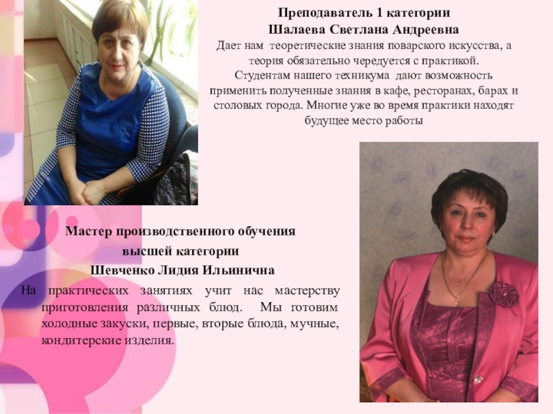 На практических занятиях учит нас мастерству приготовления различных блюд. Мы готовим холодные закуски, первые, вторые блюда, мучные, кондитерские изделия.