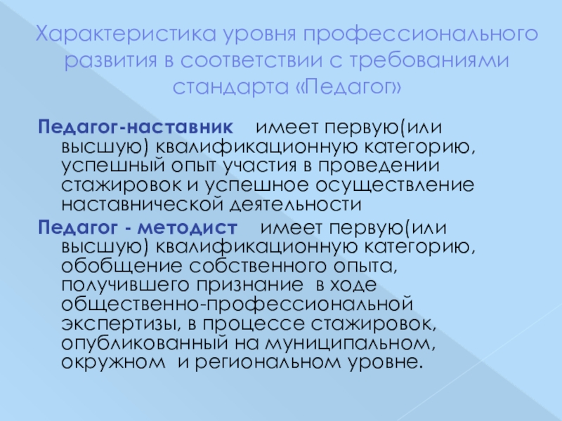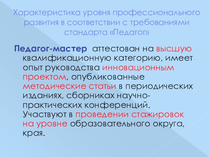 Слайд 10Характеристика уровня профессионального развития в соответствии с требованиями стандарта «Педагог»