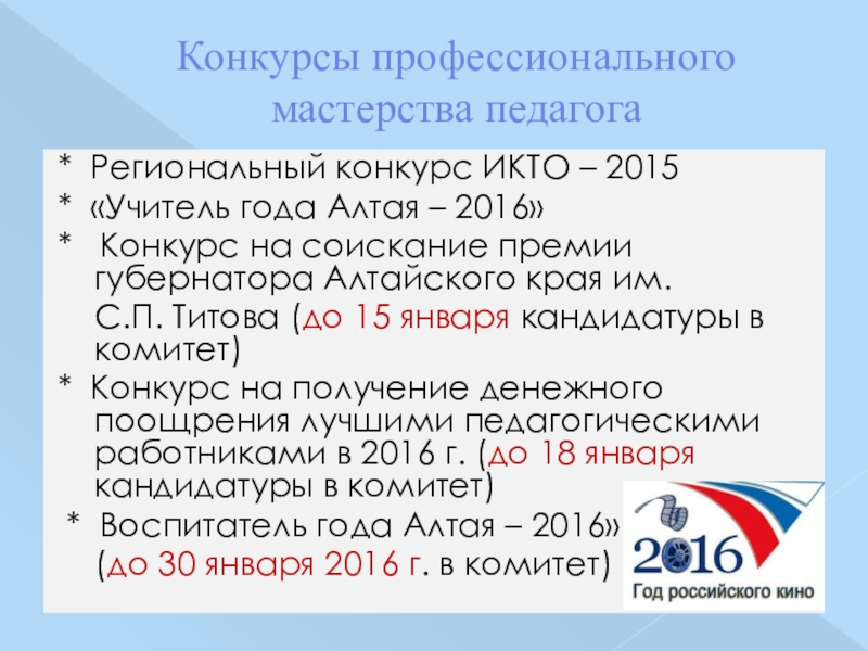 * Конкурс на получение денежного поощрения лучшими педагогическими работниками в 2016 г. (до 18 января кандидатуры в комитет)