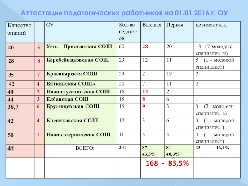 Слайд 19Аттестация педагогических работников на 01.01.2016 г. ОУ