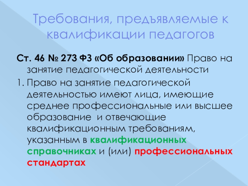 1. Право на занятие педагогической деятельностью имеют лица, имеющие среднее профессиональные или высшее образование и отвечающие квалификационным требованиям, указанным в квалификационных справочниках и (или) профессиональных стандартах