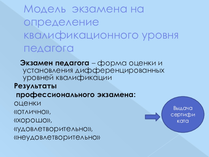Слайд 14Модель экзамена на определение квалификационного уровня педагога