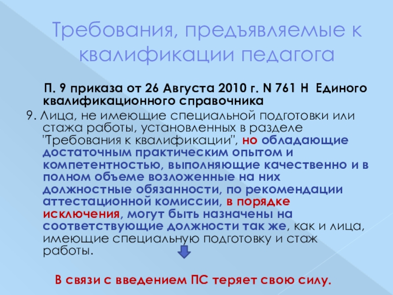 9. Лица, не имеющие специальной подготовки или стажа работы, установленных в разделе "Требования к квалификации", но обладающие достаточным практическим опытом и компетентностью, выполняющие качественно и в полном объеме возложенные на них должностные обязанности, по рекомендации аттестационной комиссии, в порядке исключения, могут быть назначены на соответствующие должности так же, как и лица, имеющие специальную подготовку и стаж работы.