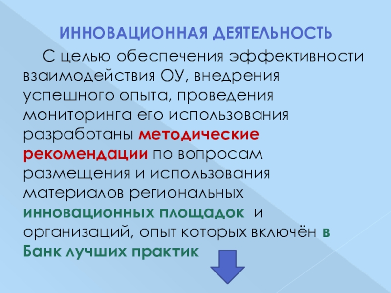 взаимодействия ОУ, внедрения успешного опыта, проведения мониторинга его использования разработаны методические рекомендации по вопросам размещения и использования материалов региональных инновационных площадок и организаций, опыт которых включён в Банк лучших практик