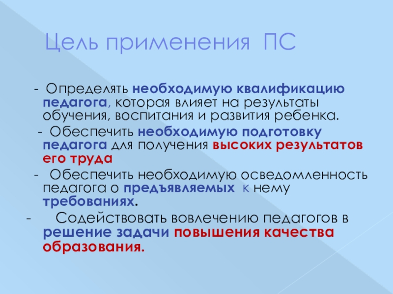- Обеспечить необходимую подготовку педагога для получения высоких результатов его труда