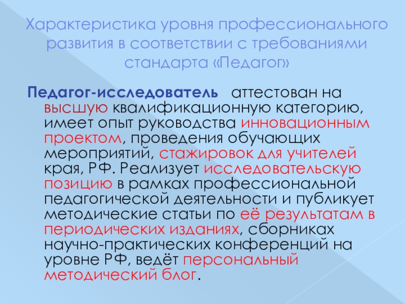 Слайд 12Характеристика уровня профессионального развития в соответствии с требованиями стандарта «Педагог»