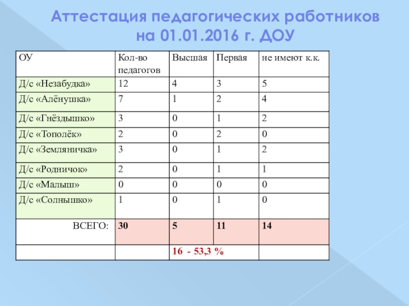 Слайд 20Аттестация педагогических работников на 01.01.2016 г. ДОУ
