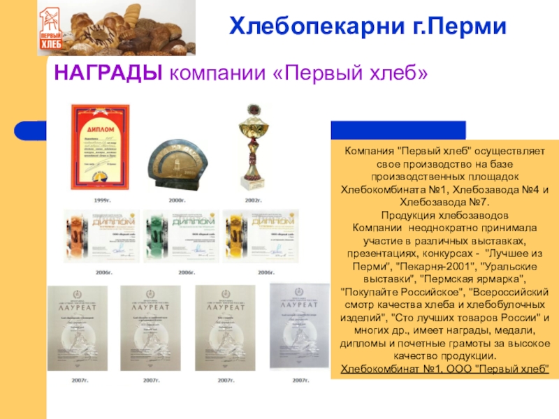 Продукция хлебозаводов Компании неоднократно принимала участие в различных выставках, презентациях, конкурсах - "Лучшее из Перми", "Пекарня-2001", "Уральские выставки", "Пермская ярмарка", "Покупайте Российское", "Всероссийский смотр качества хлеба и хлебобулочных изделий", "Сто лучших товаров России" и многих др., имеет награды, медали, дипломы и почетные грамоты за высокое качество продукции.