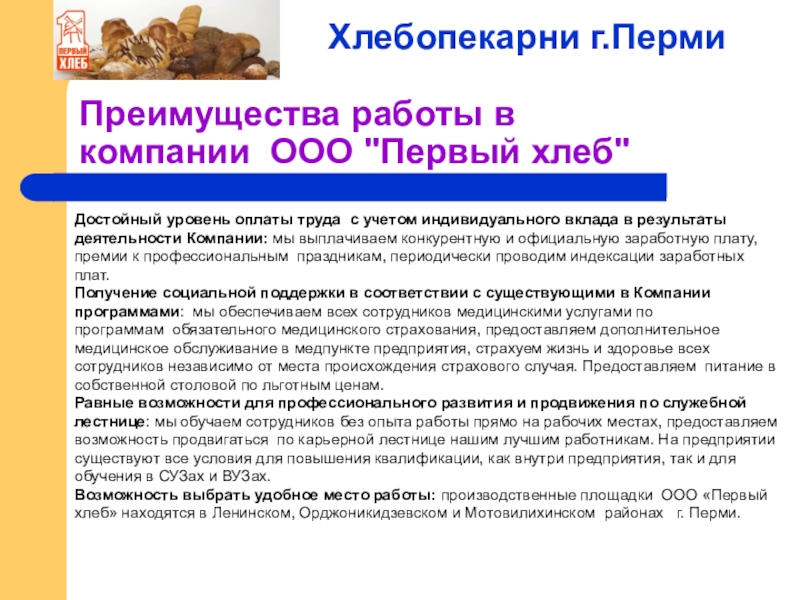 Возможность выбрать удобное место работы: производственные площадки ООО «Первый хлеб» находятся в Ленинском, Орджоникидзевском и Мотовилихинском районах г. Перми.