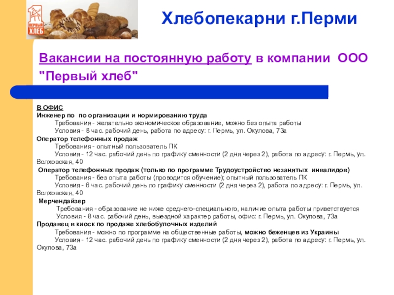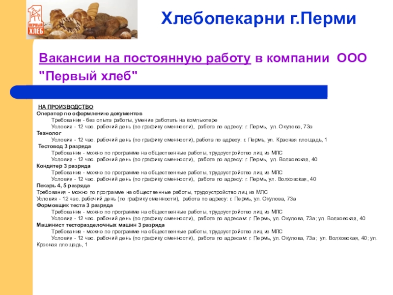Слайд 22Вакансии на постоянную работу в компании ООО "Первый хлеб"
