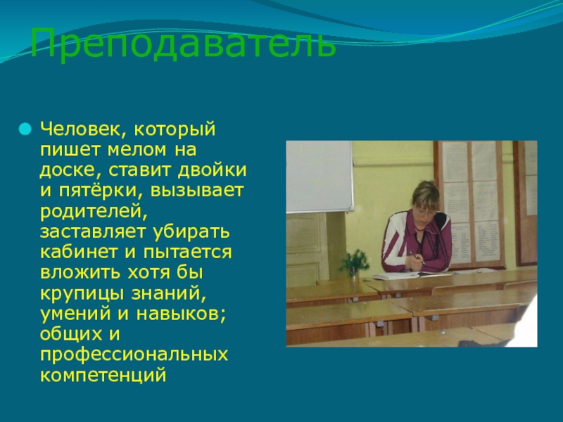Человек, который пишет мелом на доске, ставит двойки и пятёрки, вызывает