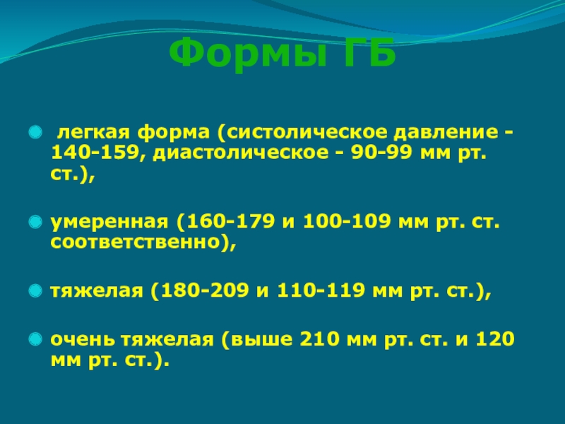 легкая форма (систолическое давление - 140-159, диастолическое - 90-99