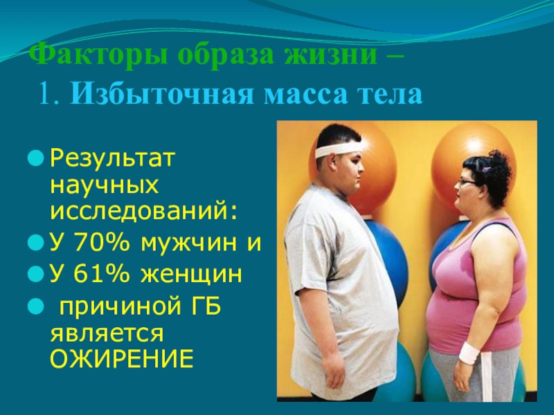 Люди, с массой тела на 20% выше нормы в 5 раз чаще страдают ГБ, чем с нормальной массой тела