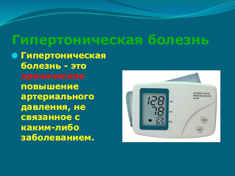 Гипертоническая болезнь - это хроническое повышение артериального давления, не связанное