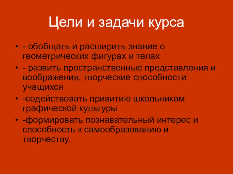 Цели и задачи курса- обобщать и расширить знание о геометрических фигурах и телах- развить пространственные представления и