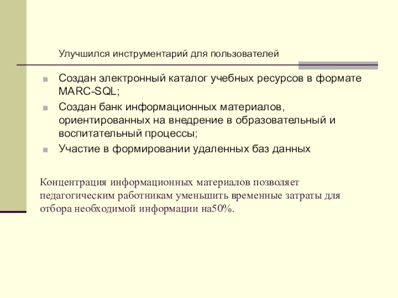 Создан электронный каталог учебных ресурсов в формате MARC-SQL;